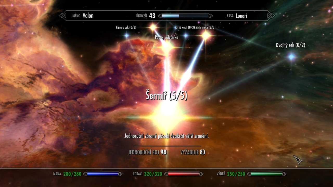 Třetí a troufl bych si říct, že i poslední problém najdeme v tzv. menu perků. Zde hráč po postupu na nový level vybírá jeden perk (jakousi zvláštní dovednost), který chce vylepšit. Celé menu má podobu noční oblohy a stromy perků jsou sestaveny do souhvězdí. A kde je problém, ptáte se? Při pohybu mezi jednotlivými perky můžete využívat buď kláves W, S, A, D, nebo tlačítek myši. Bohužel, v obou případech je obtížné se k některým perkům dostat, protože nelze jednoznačně určit směr, kterým by se obrazovka měla pohybovat.